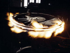 Replacing a whole wheel because of a worn contact surface proves expensive, so the concept of fitting steel tires to train wheels came about. The tire is a hoop of steel that is fitted around the steel or iron wheel. No obvious form of fastening is generally used to attach it. As with wagon wheels, the tire is held by an interference fit - it is made slightly smaller than the wheel on which it is supposed to fit. To fit a tire, it is heated up until it is glowing hot. Railroad workshops generally have special equipment to do so. As the tire heats, it expands, making it big enough to fit around the wheel. After placing it on the wheel, the tire is cooled, and it shrink fits onto the wheel. When cold, friction between the tire and the wheel is such that the tire will not budge even under quite extreme forces.