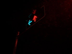 In Winnipeg, Manitoba, Canada, some of the older signals have a phase where there is a red light illuminated simultaneously with a green straight arrow. The meaning of this odd configuration is that a motorist may proceed straight, but is restricted from turning both left and right.