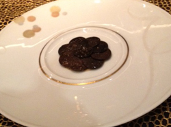 Robuchon's Degustation menu contains many of his famous trilogy dishes. (Top) Les Crustaces: Truffled langoustine ravioli, grilled spiny lobster in green curry, "chaud-froid" of sea urchin on fennel potato puree with anise citrus. Below is shown his signature truffle tart --La Truffe -- Crispy black truffle tart with onion confit and smoked ham.
